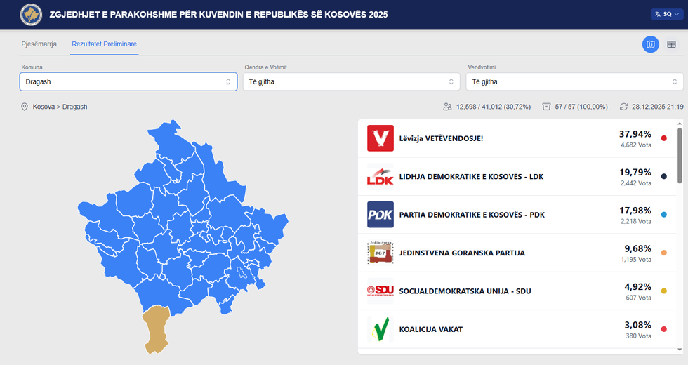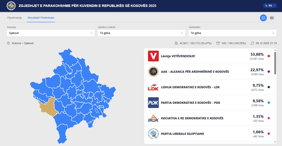 Në Gjakovë LVV është e para me 53,88% apo 22 mijë e 491 vota. Edhe në Dragash LVV është e para me 37,94% apo 4 mijë e 682 vota.