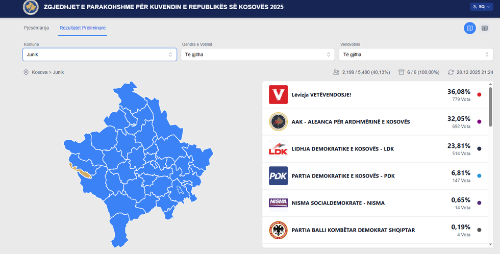 Në Junik gjithashtu e para ka dalur LVV me 36,08% apo 779 vota duke lënë pas AAK me 32.05% apo 692 vota.