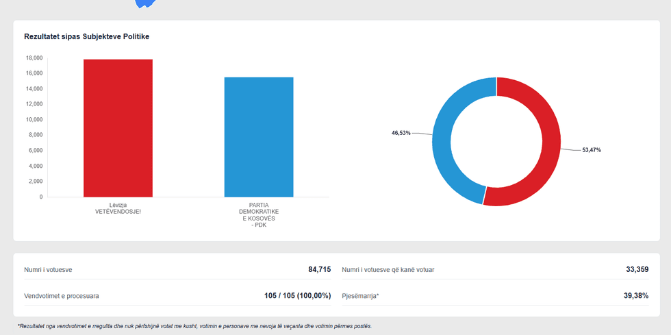 Vetëvendosje ka marrë gjithsej 17,837 vota, ndërsa PDK 15,522 vota, duke vulosur kështu fitoren e partisë në pushtet në këtë komunë.