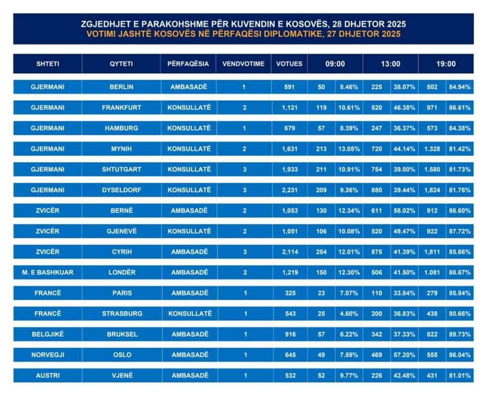 Komisioni Qendror i Zgjedhjeve ka bërë të ditur se deri në ora 19:00 ka përfunduar procesi i votimit në 25 përfaqësi diplomatike të Kosovës, ndërkohë në orën 01:00 pas mesnatës, sipas kohës lokale në Kosovë, do të përfundojë votimi në 4 përfaqësitë tjera, në Shtetet e Bashkuara të Amerikës dhe Kanada.
