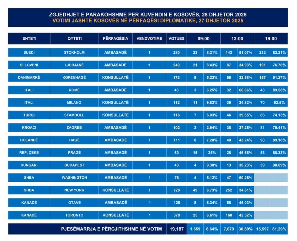 Sipas të dhënave nga 25 përfaqësi diplomatike ku është mbyllur votimi, por edhe nga të dhënat e orës 13:00 nga votimi në ShBA dhe Kanada, KQZ-ja thotë se nga 19,187 votues të regjistruar, kanë votuar 81.29% apo 15,597 votues.