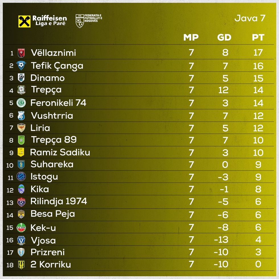 Dinamo është e treta me 15 pikë, derisa nga 14 pikë kanë Trepça dhe Feronikeli '74.