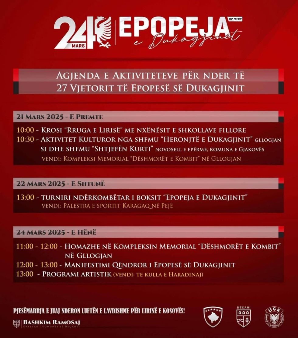 Në kuadër të shënimit të 27-vjetorit të Epopesë së Dukagjinit, janë planifikuar një sërë aktivitetesh përkujtimore dhe kulturore nga data 21 deri më 24 mars.