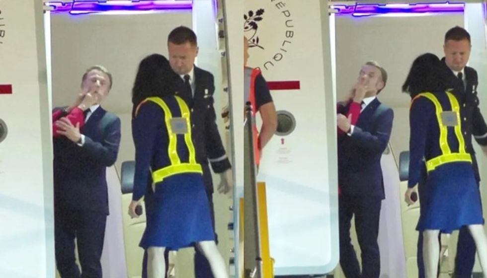 Në momentin kur dera e aeroplanit u hap, dora e Brigitte ‘godet’ fytyrën e presidentit francez.