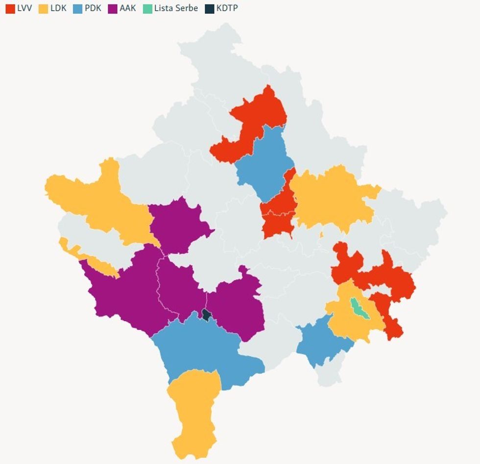 Sipas të dhënave të KQZ , Lëvizja Vetëvendosje (LVV) dhe Lidhja Demokratike e Kosovës (LDK) kryesojnë me nga 7 komuna secila.