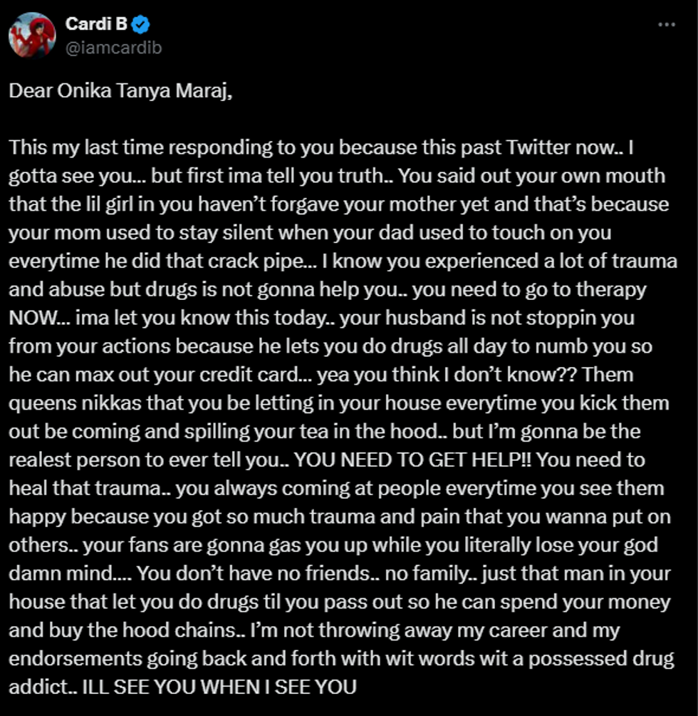 Cardi iu kundërpërgjigj duke spekuluar për përdorimin e lëndëve narkotike nga Nicki dhe ndikimin e mundshëm tek fëmijët e saj, si dhe duke përmendur një çështje të abuzimit seksual të vëllait të Nickit dhe pretendime për infertilitet të Nickit nga droga.