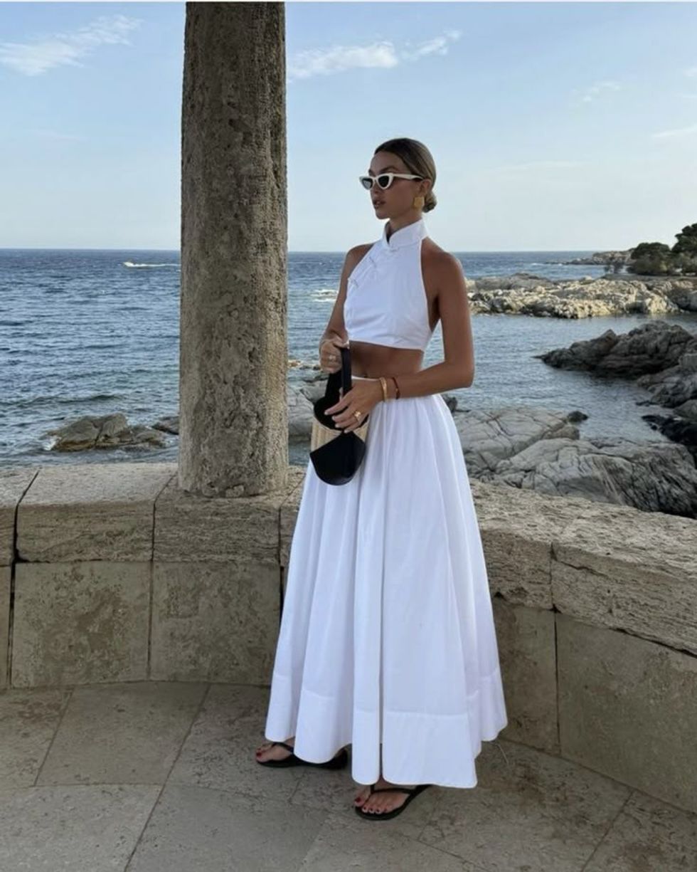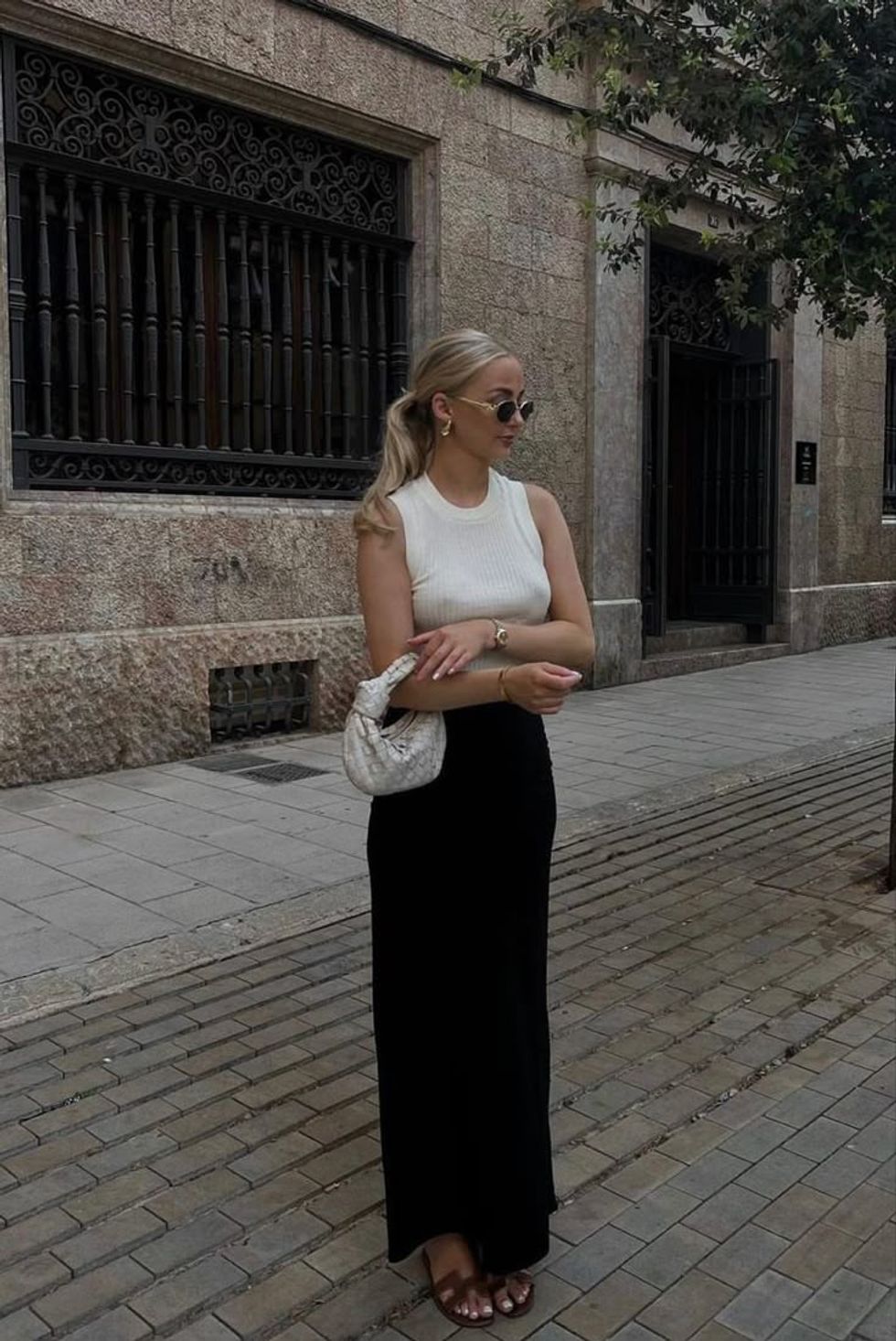 Ky është një ndër kombinimet më të thjeshta dhe më të sofistikuara për verë. Një fund mëndafshi i lehtë me një bluzë të bardhë e të pastër krijon një pamje që funksionon në çdo rast, qoftë për një dalje të zakonshme apo për një darkë.