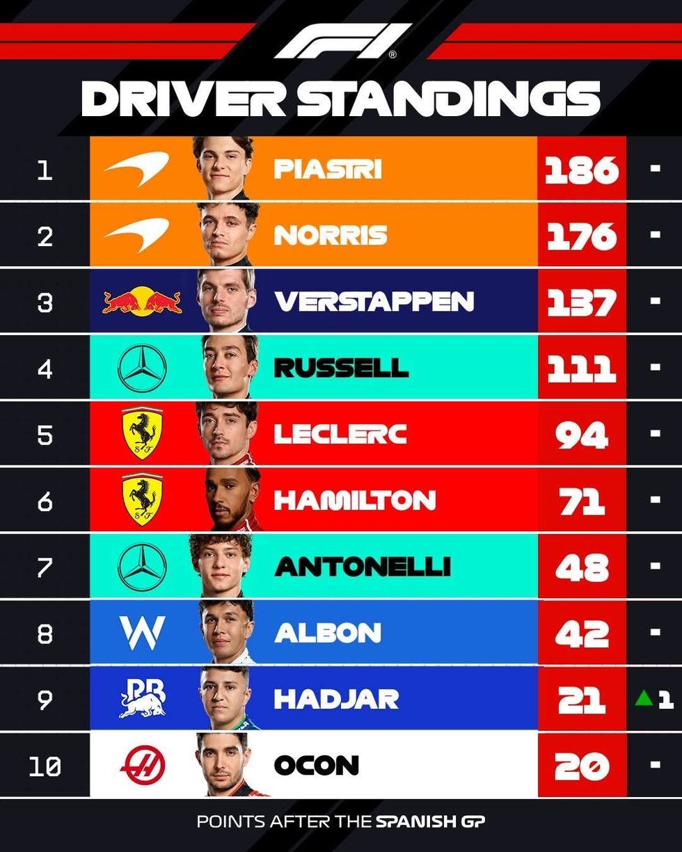 Pas kësaj gare, Piastri kryeson renditjen e përgjithshme me një avantazh prej dhjetë pikësh ndaj Norrisit, ndërsa Verstappen është 49 pikë prapa. /Telegrafi/