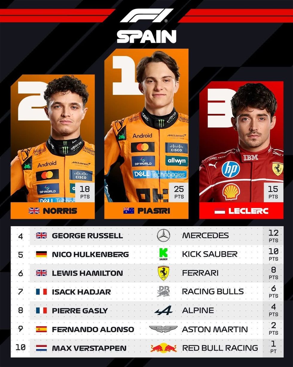 Oscar Piastri dhe McLaren kanë siguruar një fitore të dyfishtë në Çmimin e Madh të Spanjës në Formula 1, duke e lënë Lando Norris në vendin e dytë dhe Charles Leclerc të Ferrarit në podium pas një gare të jashtëzakonshme.