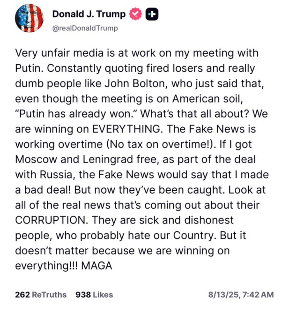 Duke postuar në Truth Social, ai sulmoi gazetarët të cilët, sipas presidentit amerikan, pretendojnë se "Putini ka fituar tashmë", transmeton Telegrafi.