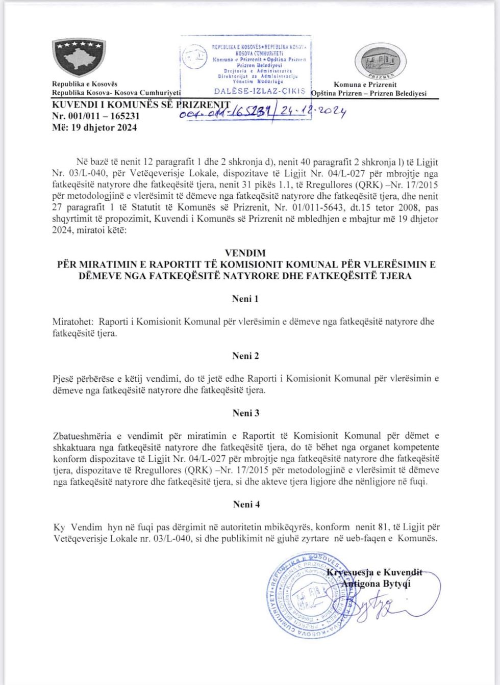 “Zbatueshmëria e vendimit për miratimin e Raportit të Komisionit komunal për dëmet e shkaktuara nga fatkeqësitë natyrore dhe fatkeqësitë tjera, do të bëhet nga organet kompetente konform dispozitave të Ligiit Nr. 04/L-027 për mbrojtje nga fatkeqësitë natyrore dhe fatkeqësitë tjera, dispozitave të Rregullores (QRK)-Nr. 17/2015 për metodologjinë e vlerësimit të dëmeve nga fatkeqësitë natyrore dhe fatkeqësitë tjera, si dhe akteve tjera ligjore dhe nënligjore në fuqi”, thuhet në nenin 3 të këtij vendimi.