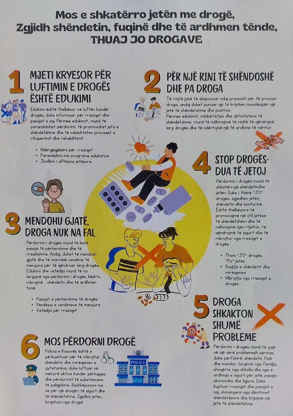 Policia e Kosovës në Rajonin e Ferizajt ka nisur një fushatë vetëdijësuese në kuadër të projektit "Thuaj Jo Drogës," duke shpërndarë fletushka informuese në qytetin e Shtimes.