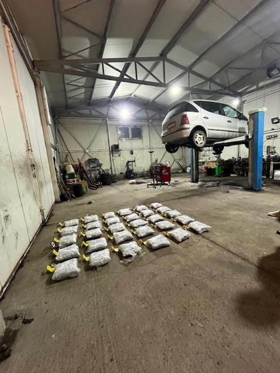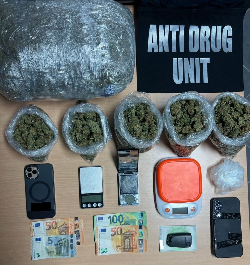 Gjatë këtij kontrolli janë gjetur: Një paketim me bari të gjelbër e dyshuar për narkotik të llojit marihuanë me peshë 1063.8 gram, një qese me bari të gjelbër e dyshuar për narkotik të llojit marihuanë me peshë 31.8 gram, sasi e pluhurit ngjyrë të bardhë e dyshuar për narkotik të llojit kokainë me peshë 22.6 gram dhe 3-peshore digjitale.