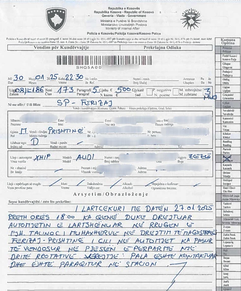 “Pas intervistimit, ndaj tij është shqiptuar një gjobë kundërvajtëse prej 500 eurosh si dhe masa mbrojtëse heqje e patentë-shoferit për 3 muaj. Policia Rajonale e Ferizajt fton qytetarët të bashkëpunojnë dhe të raportojnë çdo shkelje në komunikacion, duke njoftuar stacionin më të afërt policor ose përmes aplikacionit digjital "Lajmëro Policinë", si dhe në numrat kujdestarë: 192, 0290/326-250, 0290/322-406”, thuhet në komunikatë. /Telegrafi/