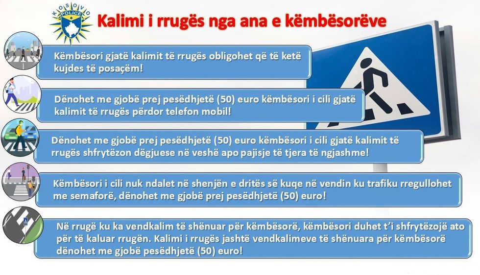 "Për të rritur sigurinë në trafik dhe për të mbrojtur këmbësorët, ftojmë të gjithë drejtuesit e mjeteve motorike të respektojnë rregullat dhe vendkalimet e dedikuara për këmbësorë. Njëkohësisht, edhe këmbësorët duhet të përdorin kalimet e shënuara dhe të jenë të kujdesshëm gjatë kalimit të rrugës", thuhet në njoftimin e policisë. /Telegrafi/