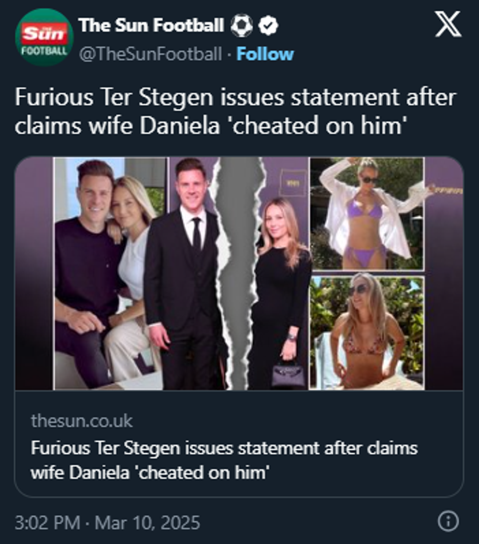 Portieri i Barcelonës, Marc-Andre ter Stegen, ka mohuar fuqishëm pretendimet në mediat spanjolle se arsyeja e divorcit të tij nga gruaja Daniela Jehla ishte pasi mësoi për tradhtinë e saj.
