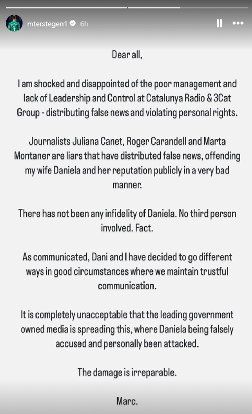 Ter Stegen njoftoi më herët përmes rrjeteve sociale se pas shqyrtimit ata kanë vendosur që tani e tutje të vazhdojnë jetën ndaras.