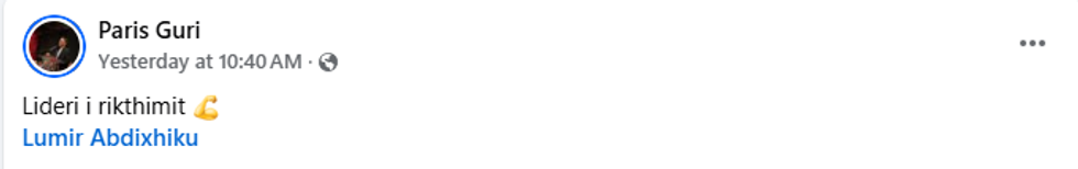 Një reagimi e bëri edhe Paris Guri, kryetar i Forumit të Rinisë. Ai publikoi fotografi me Abdixhikun ku mbishkrim kishte shkruar "Lideri i rikthimit".