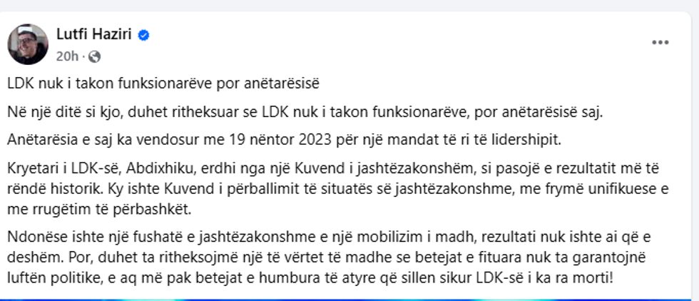 Lutfi Haziri, nënkryetari i partisë, deklaroi se "Në një ditë si kjo, duhet ritheksuar se LDK nuk i takon funksionarëve, por anëtarësisë saj".