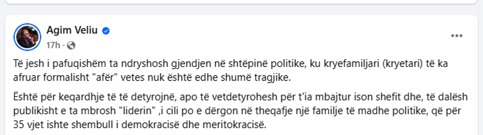 "Është për keqardhje të të detyrojnë, apo të vetdetyrohesh për t'ia mbajtur ison shefit dhe, të dalësh publikisht e ta mbrosh "liderin" ,i cili po e dërgon në theqafje një familje të madhe politike, që për 35 vjet ishte shembull i demokracisë dhe meritokracisë', shkroi ai në profilin e tij në Facebook.