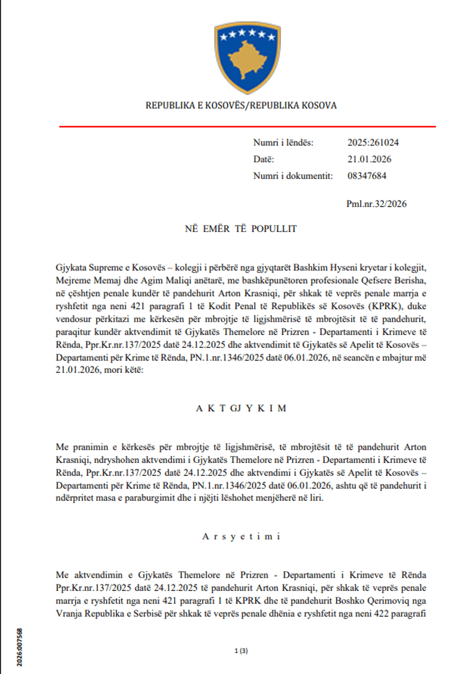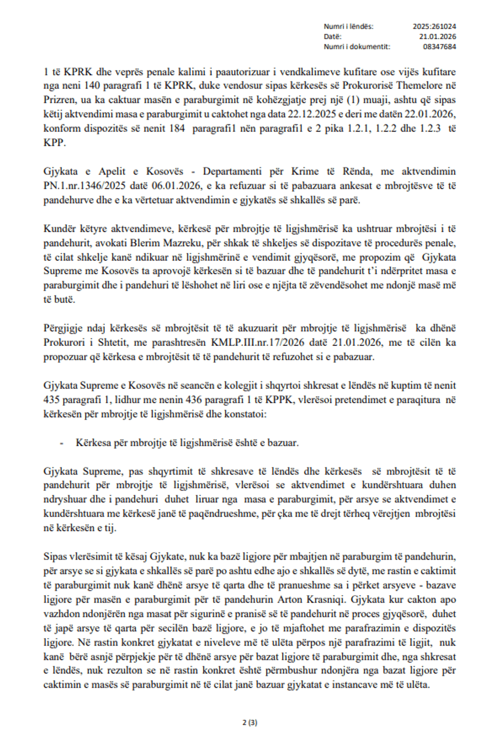 Kolegji penal i Gjykatës Supreme ka aprovuar kërkesën për mbrojtje të ligjshmërisë të Krasniqit dhe ka ndryshuar aktvendimet e mëparshme të Gjykatës Themelore në Prizren dhe Gjykatës së Apelit të Kosovës – Departamenti për Krime të Rënda, të cilat kishin caktuar paraburgimin ndaj tij.
