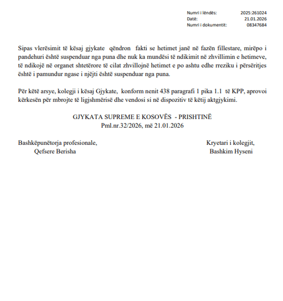 Si pasojë, masa e paraburgimit ndaj Krasniqit është ndërprerë më 6 janar 2026 dhe ai është liruar nga burgu për t’u mbrojtur në liri deri në përfundim të procesit gjyqësor.