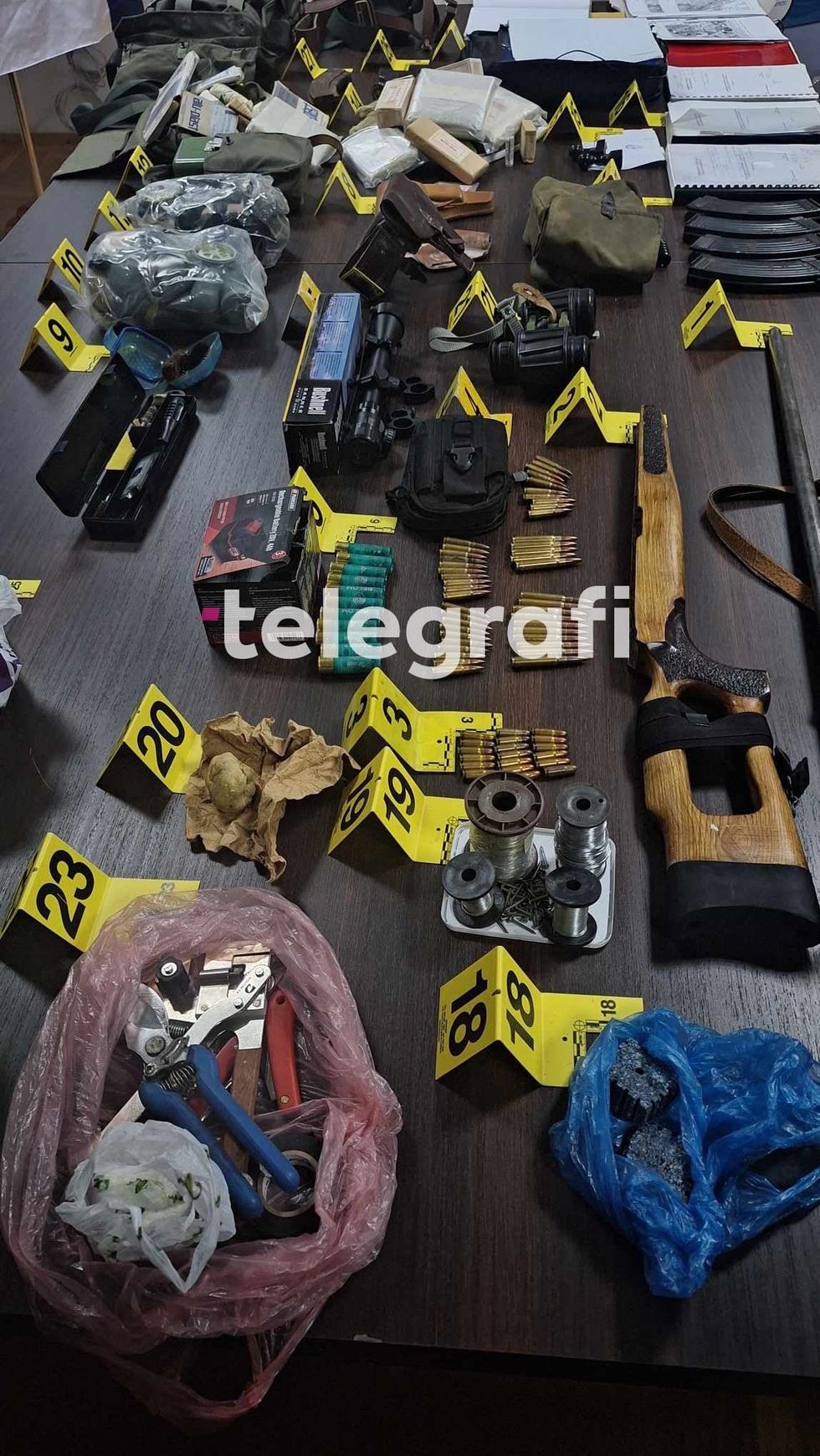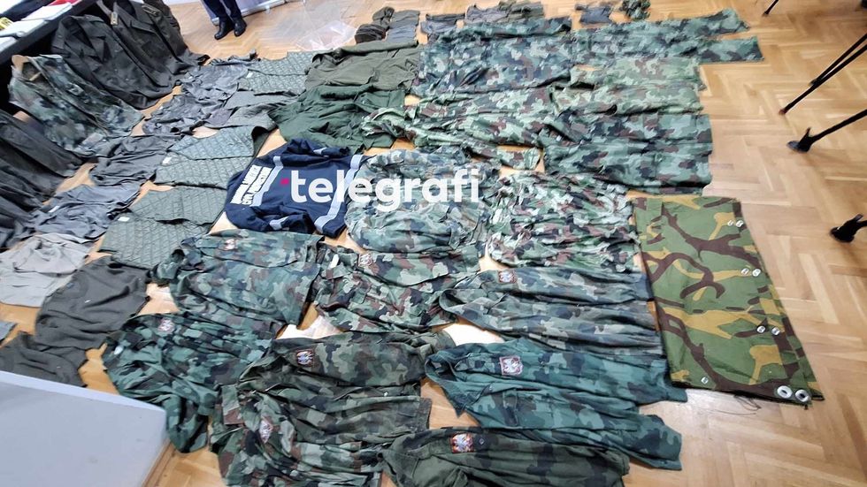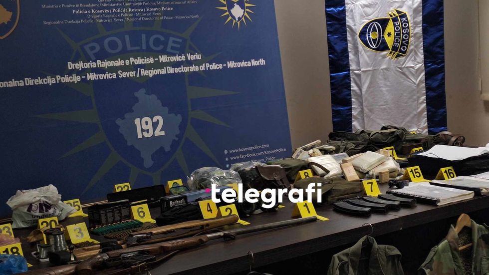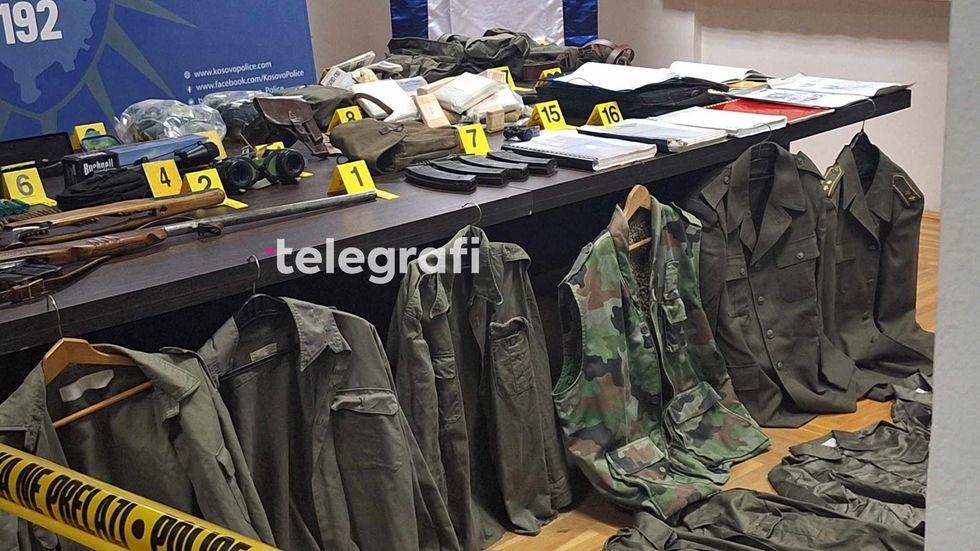 "Një pushkë një tytëshe, kondakt pushke, 19 fishekë për pistoletë, një çantë me 45 fishekë për armë të gjatë, një palë dylbi për snajper, një çantë me katër karikatorë të zbrazët dhe një kuti me vaj. Pajisje për pastrimin e armës, dy gaz maska, pajisje ushtarake për ushqim, çantë për ndihmë të parë, qese për pajisje dhe ndihmë te parë, dy vula, literaturë të ndryshme, çantë me dokumente, substanca të fyshuara të eksplozivit, telefona, substancë e dyshuar e eksplozivit, dylbi, dy shigjeta, substance e dyshuar e eksplozivit, substance e dyshuar e eksplozivit, thike, jaknje me mbishkrime si dhe 31 deri ne 40 uniforma ushtarake të ndryshme. Në mesin e uniformatave të sekuestruara është edhe një uniformë e te ashtuquajturës "Mbrojtja Civile", organizatë e shpallur terroriste nga Qeveria e Kosovës, që tregon se kemi ende mbetje aktive të kësaj organizate që tentojnë të minojnë rendin kushtetues... ekziston mundësia që janë edhe dy armë mungesë, të cilat ne jemi duke punuar po shpresojmë që do i gjejmë edhe dy armët tjera të cilat janë pjesë e këtij materiali të sekuestruar", shtoi Hoxha në konferencë për media.