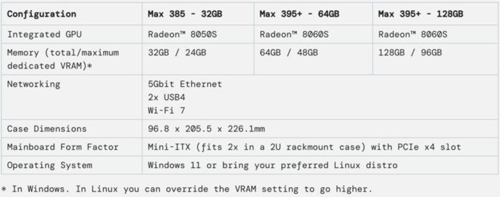 Edhe pse ka përmasa mini-ITX, është një kompjuter shumë i fuqishëm i mundësuar nga seria e procesorëve AMD Ryzen AI 300, i cili mund të kombinohet me deri në 128 GB memorie pune LPDDR5x-8000.