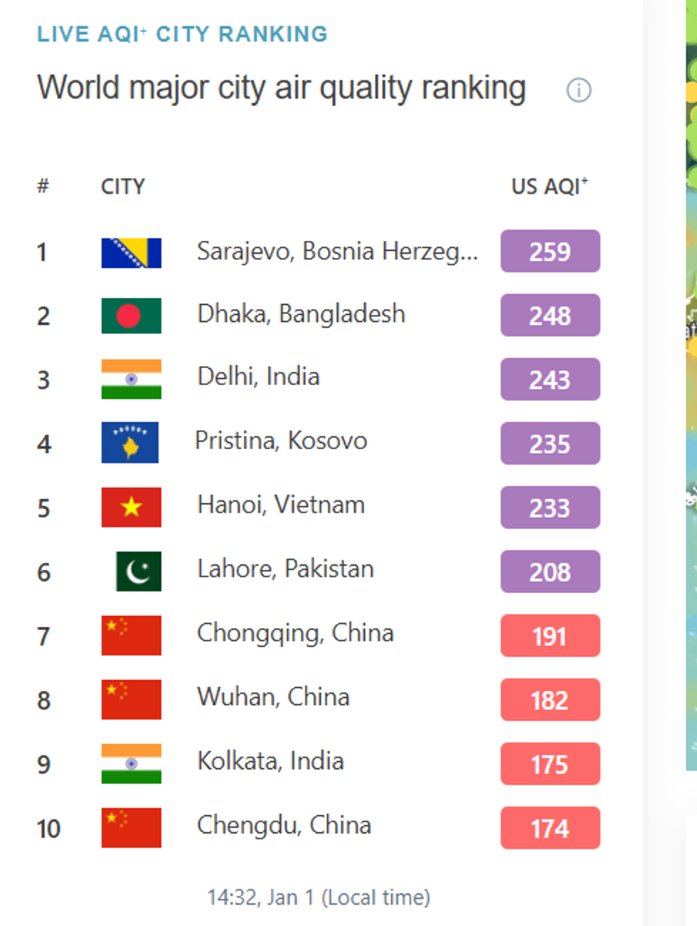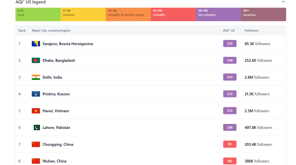 Sipas kësaj rangliste, qyteti i parë me ajrin më të ndotur është Sarajeva, pastaj Dhaka në Bangladesh, Delhi dhe në të katërtin është Prishtina.