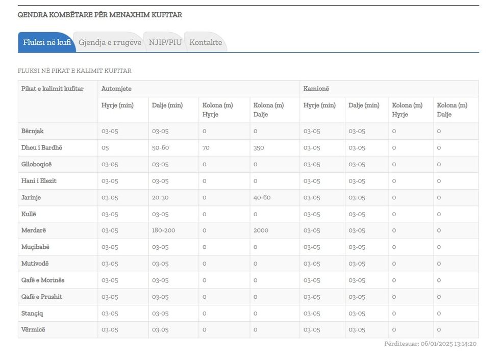Sipas të dhënave të publikuara në faqen e Ministrisë së Punëve të Brendshme, në të gjitha pikat për hyrje në Kosovë janë të qeta ku pritjet janë 3 - 5 minuta. /Telegrafi/