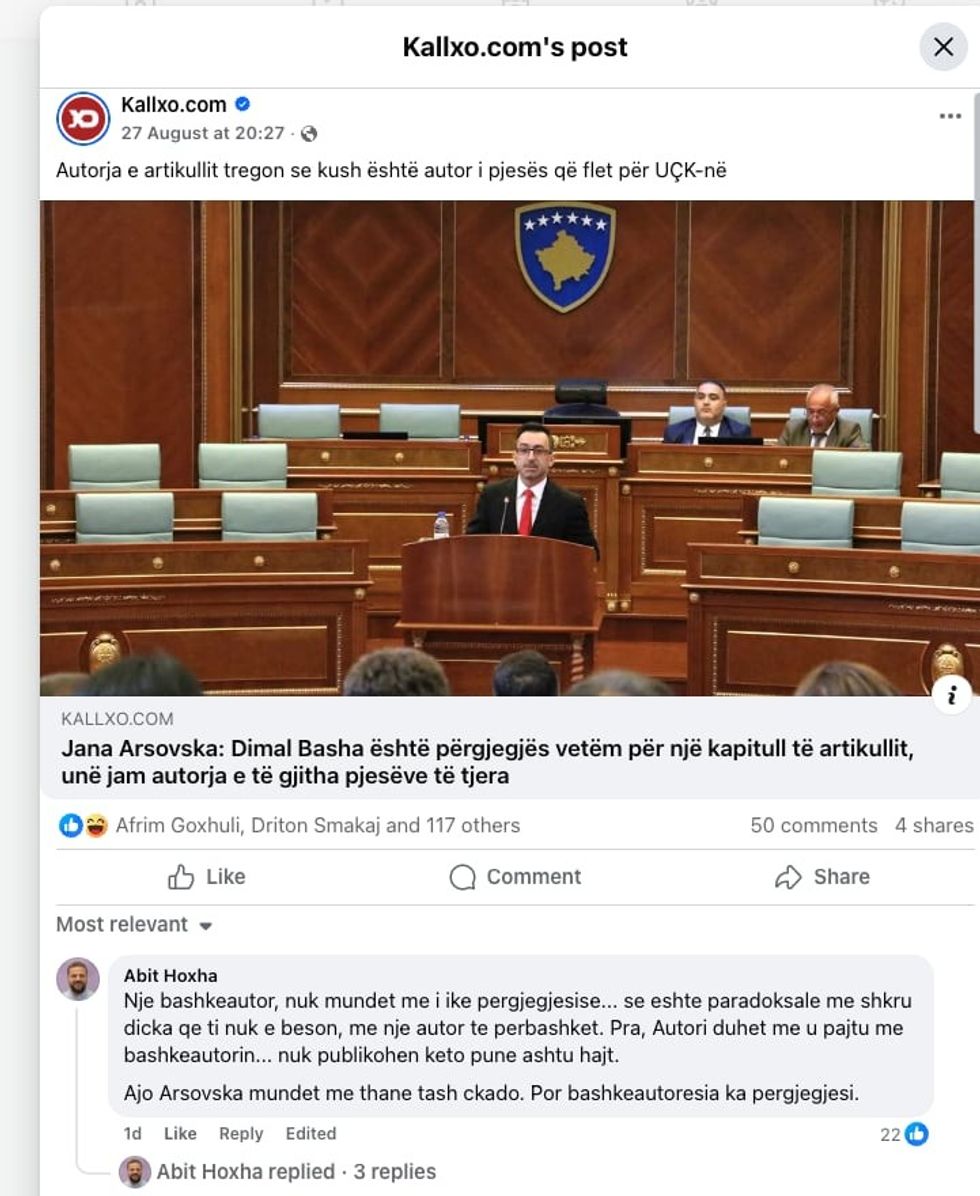 “Një bashkëautor nuk mund t’i ikë përgjegjësisë. Është paradoksale të shkruash diçka që ti nuk e beson, me një autor tjetër të përbashkët. Autori duhet të pajtohet me bashkëautorin, sepse këto punë nuk publikohen ashtu kot. Arsovska tash mund të thotë çka të dojë, por bashkëautoresia ka përgjegjësi”, u shpreh Hoxha.