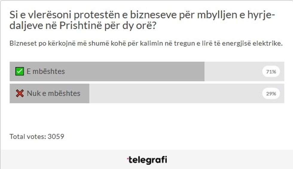 Në një sondazh të zhvilluar nga Telegrafi, me pyetjen: “A e vlerësoni protestën e bizneseve për mbylljen e hyrje-daljeve në Prishtinë për dy orë?”, shumica dërrmuese e pjesëmarrësve kanë shprehur mbështetjen e tyre.