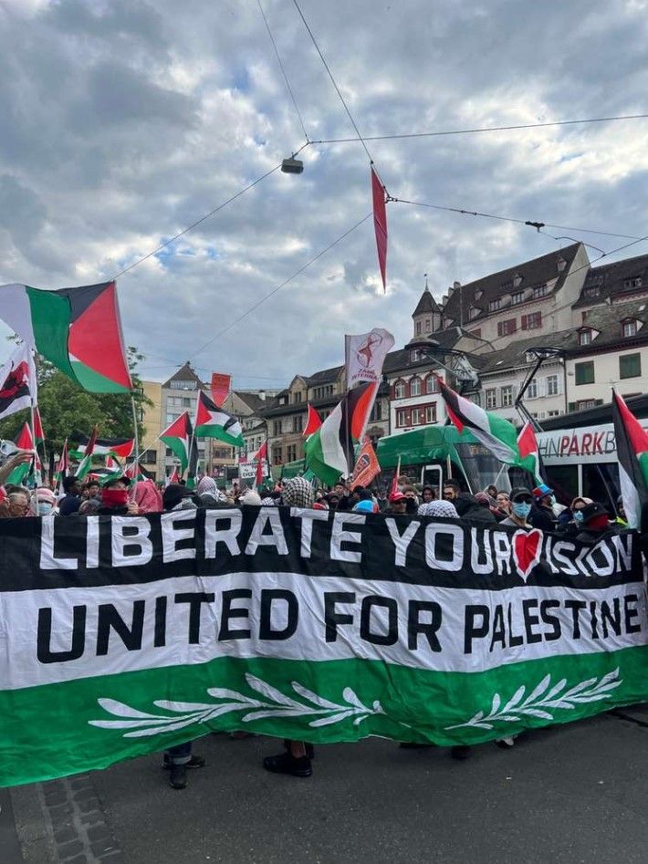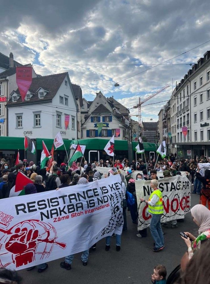 Demonstrata u organizua nga grupet lokale Basel 4 Palestine dhe ESCalate for Palestine, dhe në të morën pjesë qindra protestues palestinezë që valëvitnin flamuj dhe mbanin pankarta ku akuzohej Transmetuesi Evropian i Eurovisionit (EBU) për bashkëfajësi në atë që ata e quajtën “gjenocidi” i Izraelit. Po ashtu, u bënë thirrje të drejtpërdrejta për bojkotimin e festivalit.