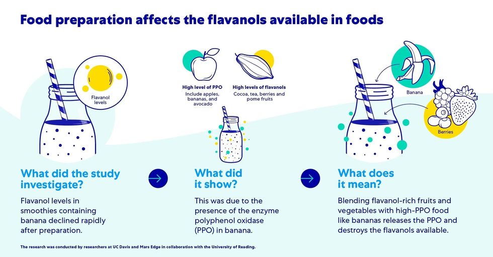 Shkencëtarët donin të shqyrtonin, në një nivel shumë praktik, se si ushqimet dhe përgatitja e zakonshme e vakteve, siç janë smoothiet me bazë bananeje, mund të ndikojnë në disponueshmërinë e flavanoleve që absorbohen pas një vakti.