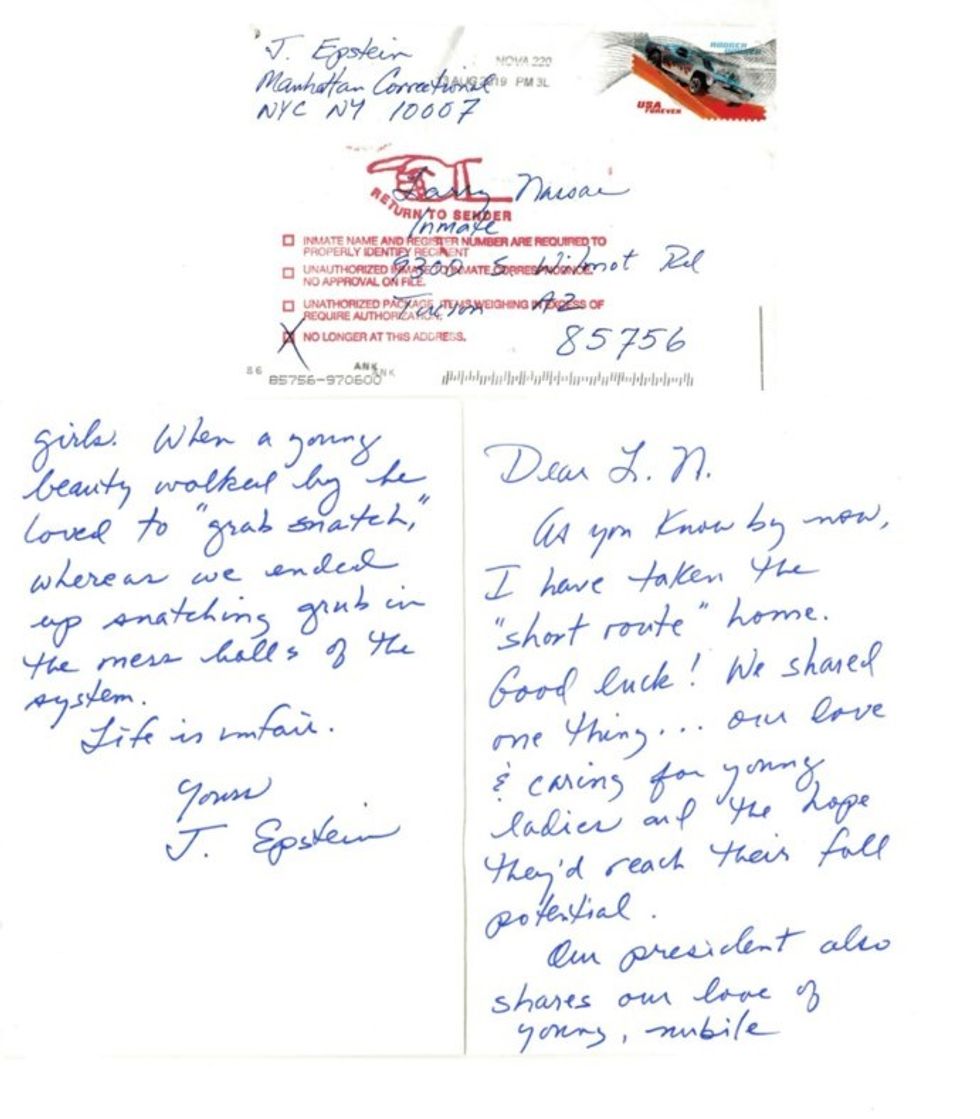 Letra është e datuar 13 gusht 2019, tri ditë pas vdekjes së Epstein në paraburgim, e cila u klasifikua si vetëvrasje. Ajo u gjet nga hetuesit në zyrën e postës së burgut disa javë më vonë, pasi ishte kthyer nga një burg në Arizona dhe ishte shënuar “nuk është më në këtë adresë”.
