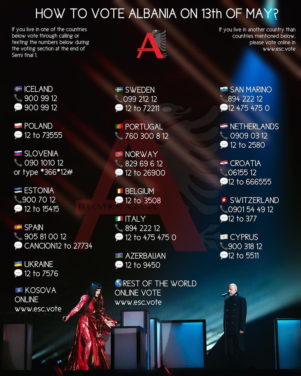 Faqja zyrtare Eurovision Albania në Instagram ka publikuar tashmë të gjitha mënyrat se si shqiptarët mund të votojnë për të përkrahur grupin “Shkodra Elektronike”. Votimi do të hapet në fund të mbrëmjes dhe është i mundur nga të gjithë qytetarët që jetojnë në shtetet që marrin pjesë në natën e parë gjysmëfinale dhe që kanë të drejtë të votojnë. Shqipëria është e 12-ta me radhë, me çka për të votuar, duhet dërguar vetëm kodin "12".
