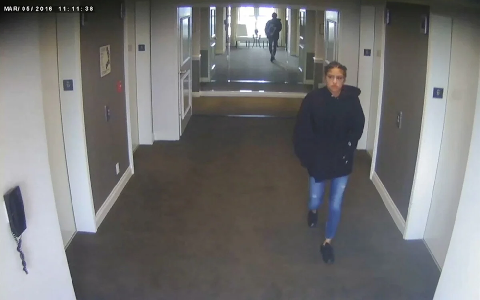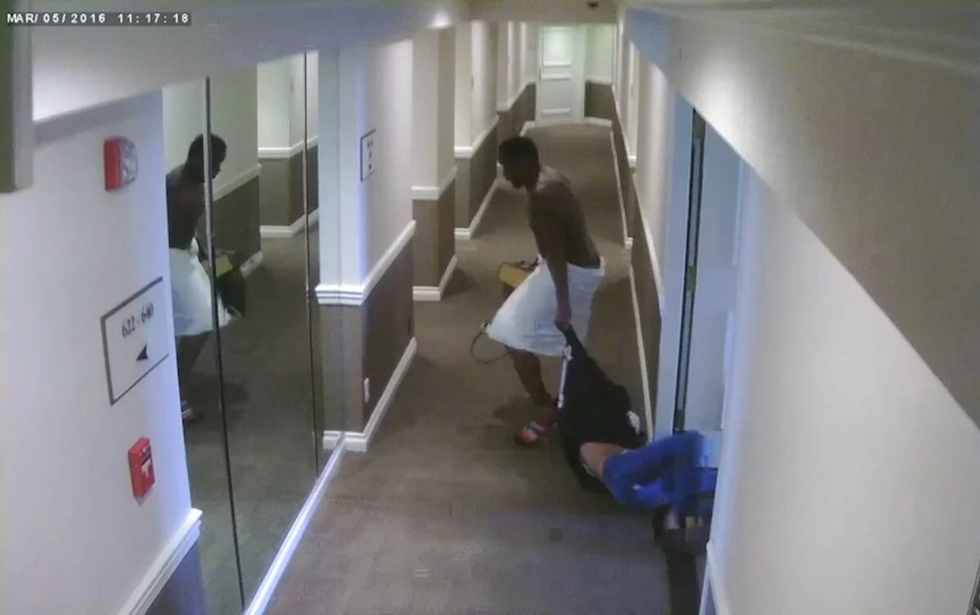 Ajo mbante një çantë të madhe dhe ecte nëpër korridor, pas së cilës u kthye majtas në një pjesë të hotelit që nuk është e dukshme në video. Disa sekonda më vonë, reperi filloi të vraponte pas saj. Ai ishte gjysmë i zhveshur.