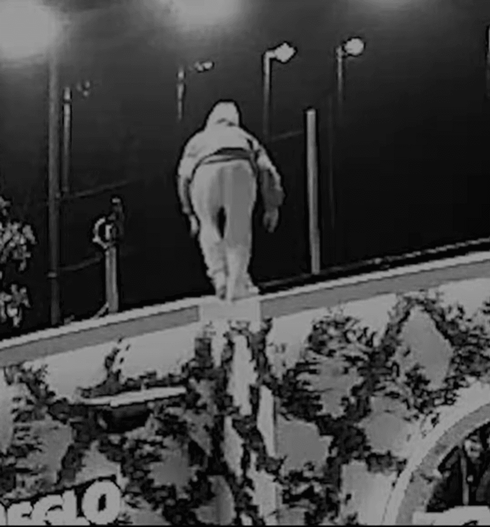 Pas disa sekondash, ai arrin të kalojë murin dhe të zbresë në një zonë e cila është gjithashtu e mbuluar nga kamerat e vëzhgimit.