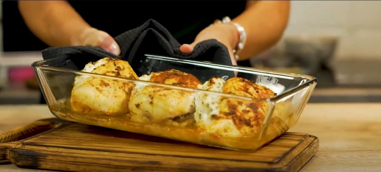 Hapi 3: Përziejini të gjithë përbërësit e mbushjes dhe mbushni “xhepin” e çdo filetoje.