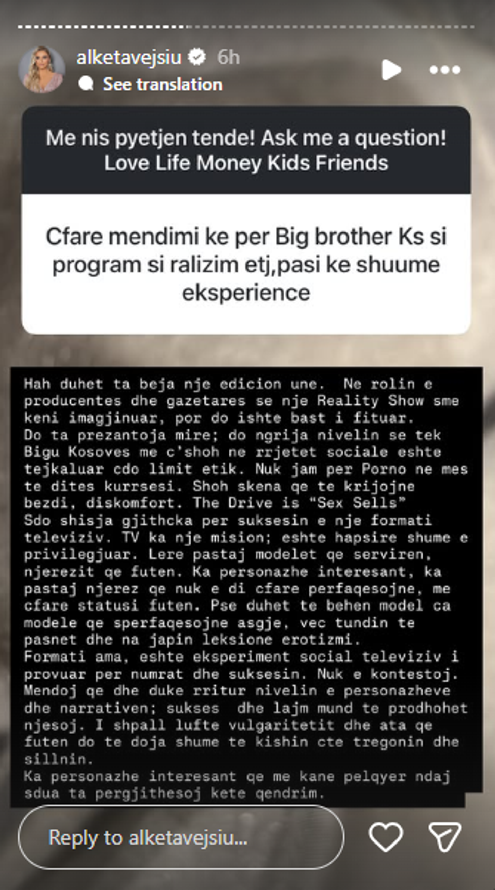 “Hah duhet ta bëja një edicion unë. Në rolin e producentes dhe gazetares së një Reality Show s’më keni imagjinuar, por do ishte bast i fituar. Do ta prezantoja mirë; do ngrija nivelin se tek Bigu Kosovës me ç’shoh në rrjetet sociale është tejkaluar çdo limit etik. Nuk jam për Porno në mes të ditës kurrsesi. Shoh skena që të krijojnë bezdi, diskomfort. The Drive is “Sex Sells” S’do shisja gjithçka për suksesin e një formati televiziv. TV ka një mision; është hapësirë shumë e privilegjuar. Lërë pastaj modelet që serviren, njerëzit që futen. Ka personazhe interesantë, ka pastaj njerëz që nuk e di çfarë përfaqësojnë, me çfarë statusi futen. Pse duhet të bëhen model ca modele që përfaqësojnë s’di çfarë, vetëm t’i tundojnë të pasmet dhe na japin leksione erotizmi. Formati ama, është eksperiment social televizi i provuar për numrat dhe suksesin. Nuk e kontestoj. Mendoj që dhe duke rritur nivelin e personazheve dhe narrativen; sukses dhe lajm mund të prodhohet njësoj. I shpall luftë vulgaritetit dhe ata që futen do të doja shumë të kishin ç’të tregonin dhe sillnin. Ka personazhe interesant që më kanë pëlqyer ndaj s’dua ta përgjithësoj këtë qëndrim”.