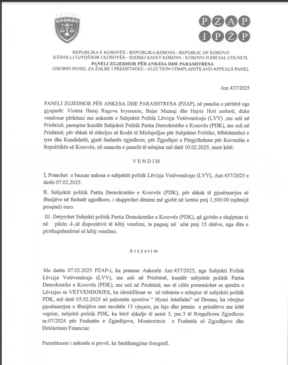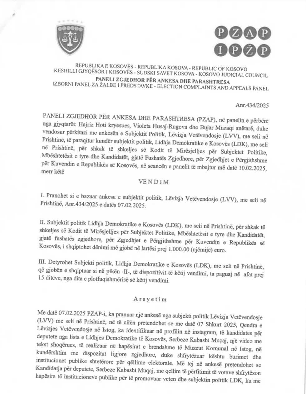 Në vendimet e fundit që janë publikuar nga PZAP më 10 shkurt 2025, ky institucion ka shqiptuar afro 10 mijë euro për LVV-në, PDK-në e LDK-në.
