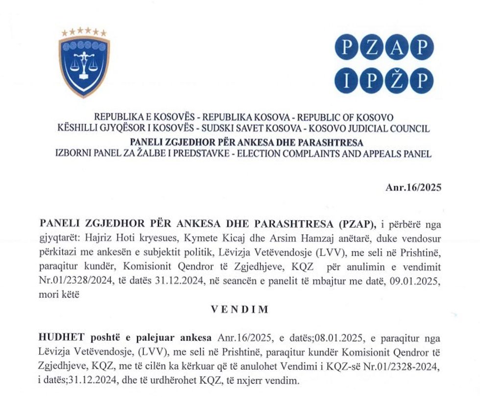 “HUDHET poshtë e palejuar ankesa Anr. 16/2025 e datës 08.01.2025, e paraqitur nga Lëvizja Vetëvendosje (LVV), me seli në Prishtinë, paraqitur kundër Komisionit Qendror të Zgjedhjeve, KQZ, me të cilën ka kërkuar që të anulohet Vendimi i KQZ-së Nr. 01/2328-2024, i datës 31.12.2024, dhe të urdhërohet KQZ, të nxjerr vendim”, thuhet në vendimin e PZAP-së.