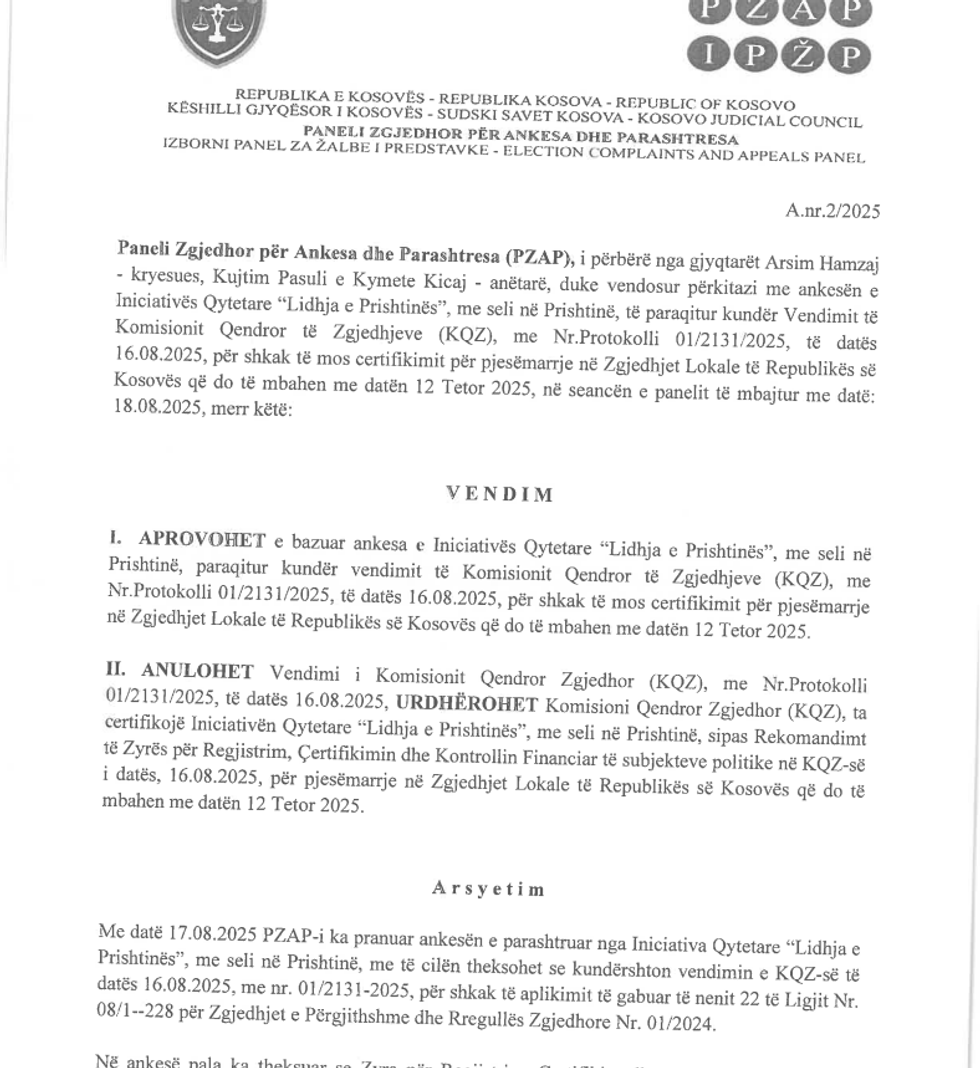 Sipas vendimit, PZAP ka vendosur në seancën e mbajtur më 18 gusht 2025 lidhur me ankesën e Iniciativës Qytetare “Lidhja e Prishtinës”, me seli në Prishtinë, të paraqitur kundër vendimit të Komisionit Qendror të Zgjedhjeve (KQZ) të datës 16.08.2025, për shkak të mos certifikimit për pjesëmarrje në Zgjedhjet Lokale të Republikës së Kosovës që do të mbahen më 12 tetor 2025.