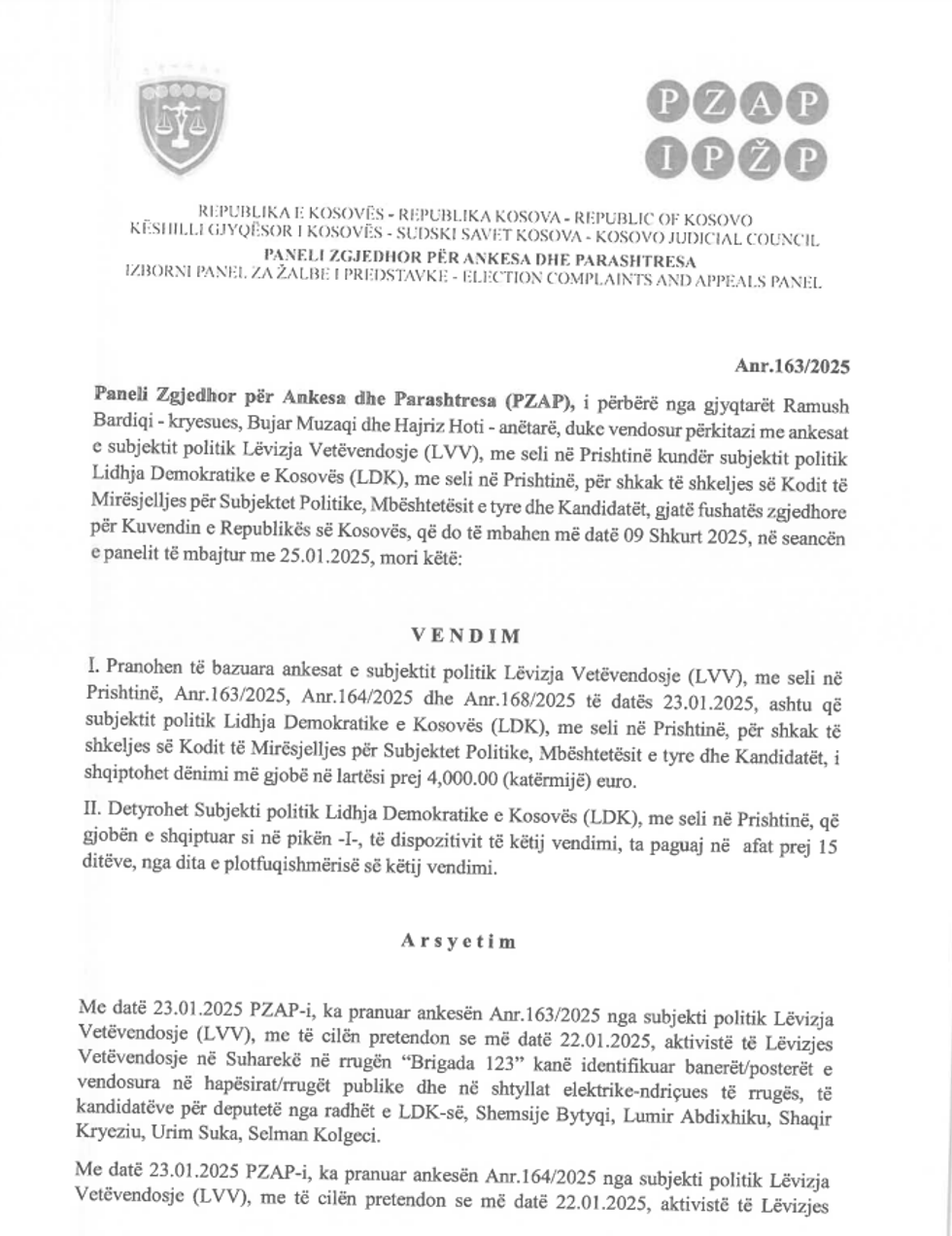 LVV ka dorëzuar ankesë në PZAP kundër LDK-së e cila është dënuar me 4 mijë euro, për shkak të vendosjes së posterave të kandidatëve për deputetë në hapësirat/rrugët publike në Suharekë.