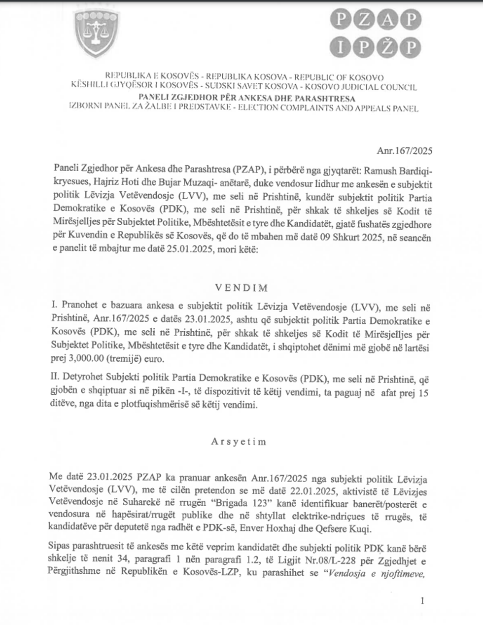 Për të njëjtën arsye, LVV ka dorëzuar ankesë edhe ndaj PDK-së e cila është dënuar me 3 mijë euro.