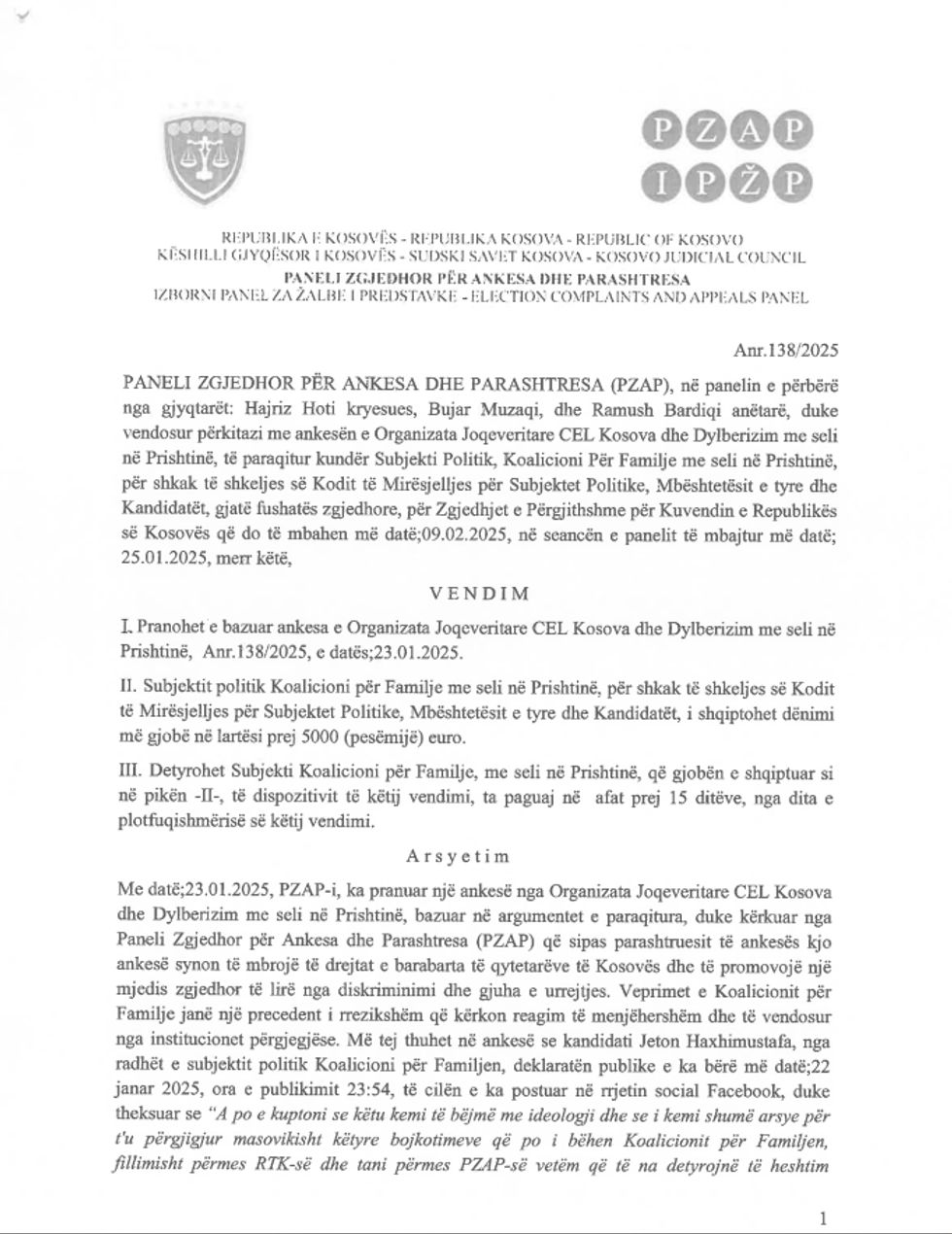 Gjobës nuk i ka shpëtuar as Koalicioni për Familje. PZAP-ja ka gjobitur Koalicioni për Familje me 5000 euro pas ankesës së bërë nga organizata joqeveritare “CEL Kosova dhe Dylberizmi”.