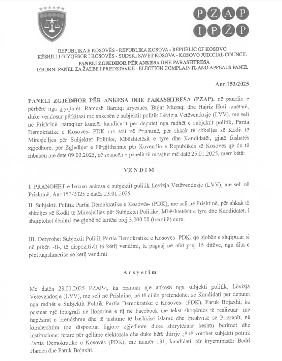 PDK është dënuar edhe me 3 mijë euro të tjera, shkak i ankesës së LVV-së dorëzuar në PZAP, për shkak të një postimi në Facebook të kandidatit Faruk Bojaxhi e ku ka përdorur objekte fetare.