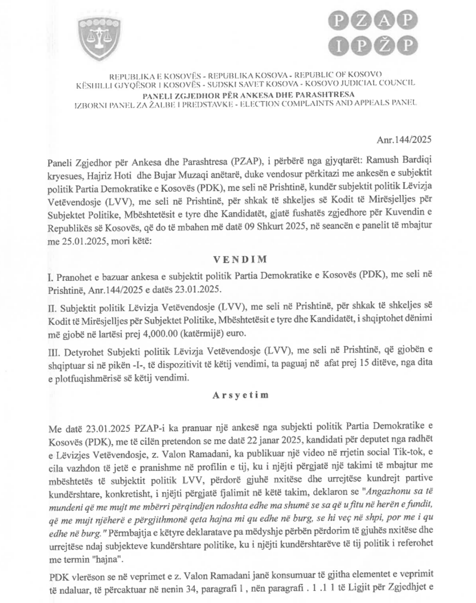 Pavarësisht ankesave të shumta, LVV gjithashtu është gjobitur me 4 mijë euro nga PZAP, lidhur me një ankesë të dorëzuar nga PDK për një video të postuar në TikTok nga kandidati nga radhët e LVV-së, Valon Ramadani.