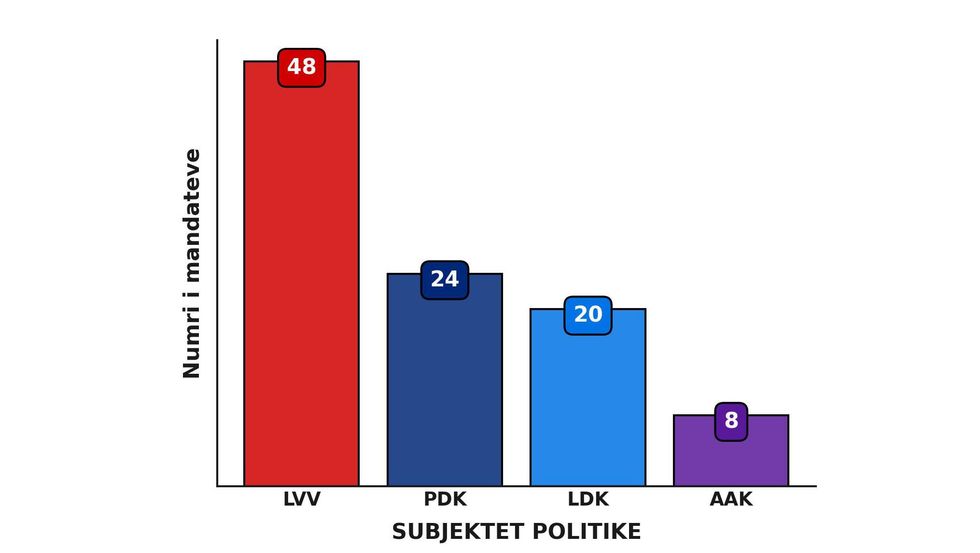 Në bazë të rezultateve preliminare të KQZ-së, pa numëruar votat e diasporës e ato me kusht, LVV-ja pritet t’i ketë 47 deputetë, PDK-ja 25, LDK-ja 20 dhe AAK-Nisma 8. /KP/