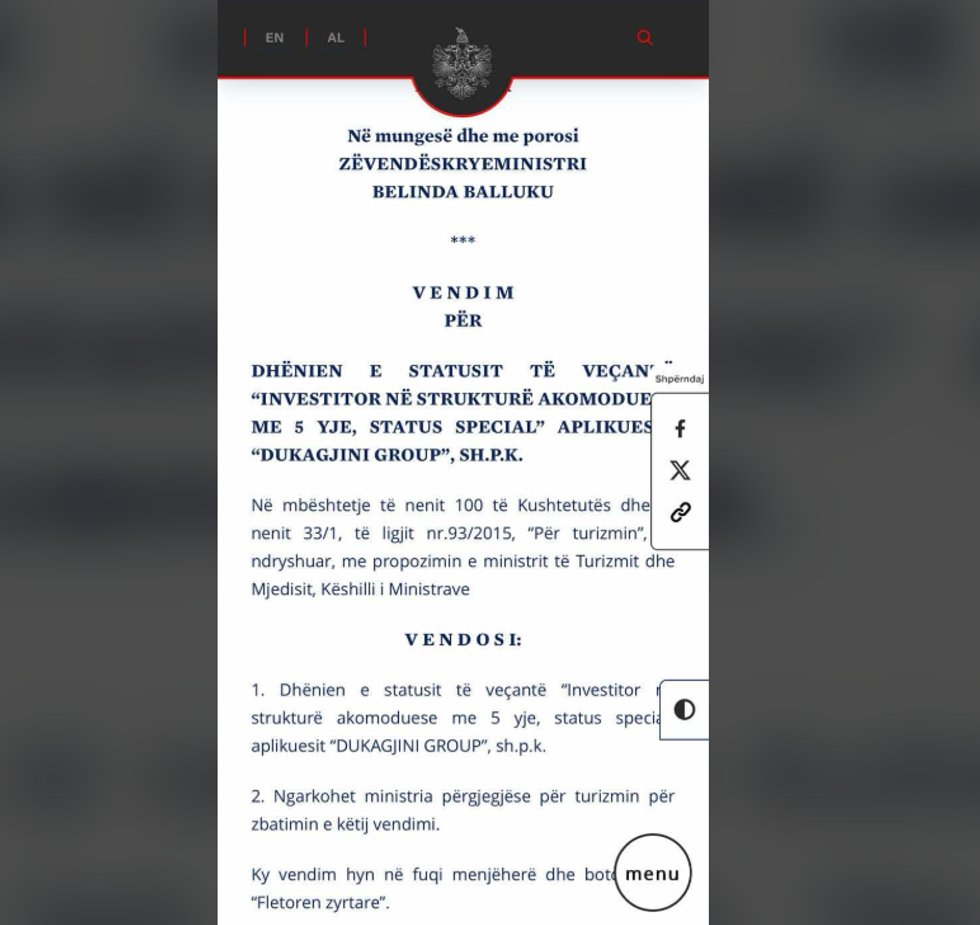 Është Qeveria e Shqipërisë që tashmë edhe zyrtarisht “Dukagjini Group” i ka dhënë stastusin e veçantë “Investitori në strukutrë akomoduese me 5 yje, status special”.